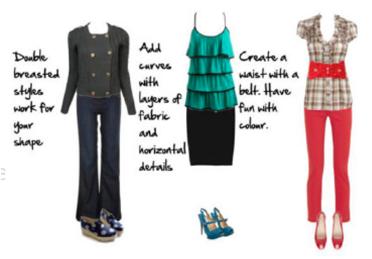 Jackets should emphasize your waist, belted and double-breasted styles work well, patch pockets can add curves.
